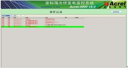 事件記錄監測畫面 監控系統可針對光伏發電現場的各種事件進行記錄,如:通訊采集異常、開關變位、操作記錄等,時間記錄支持按類型查詢,并可對越限報警進行更改設置;