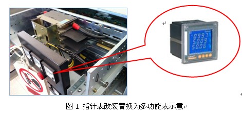 原安裝儀表為機(jī)械式指針表,重新改裝多功能網(wǎng)絡(luò)電力儀表。儀表取信號為:輔助電源(AC220V)取自當(dāng)前抽屜內(nèi)開關(guān)上端A相電壓;測量電壓信號取自當(dāng)前抽屜內(nèi)開關(guān)下端各相電壓;電流信號取自電流互感器電流二次輸出信號。通訊組網(wǎng)為采用屏蔽雙絞線將現(xiàn)場22只儀表以手拉手的總線型方式直接引致后臺監(jiān)控主機(jī),為保證通訊可靠性及防浪涌保護(hù),于主機(jī)端加裝通訊轉(zhuǎn)換隔離器進(jìn)行保護(hù)。儀表改裝如圖1所示。
