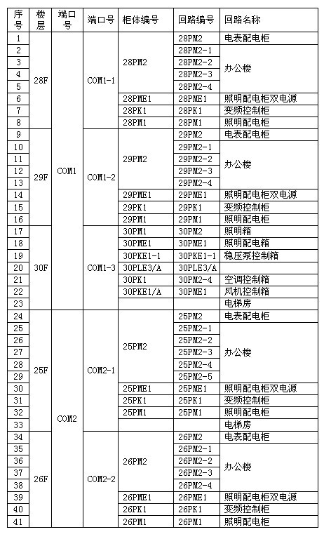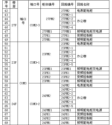 根據環智國際大廈高低壓配電系統一次圖確定需要進行監控的回路,并根據現場配電柜安裝的實際位置合理確定通訊線纜的走向及通訊端口的分配,如下表所示(部分):