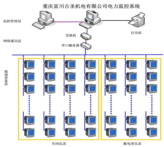 重慶富川機電有限公司是中國生產汽車、摩托車及通用機械電裝品和齒輪的知名品牌企業。地處重慶市九龍坡區白市驛工業園區,總占地面積60余畝,廠房面積近4萬平方米,擁有員工近1000人。重慶富川古圣機電有限公司是重慶富川在北碚的一個分公司,2011年剛投產。由于本身是一個生產型的企業,車間的用電設備基本上是大功率電機,單個三相回路電流大的時候能夠達到400多A,設備的價格都比較昂貴。為了更加便利地對公司員工的作業情況進行管理和用電設備運行狀況的掌控,以便在節能降耗的同時提高生產效率,重慶富川于2011年初購買了上海安科瑞電氣股份有限公司的Acrel-2000型電力監控系統。