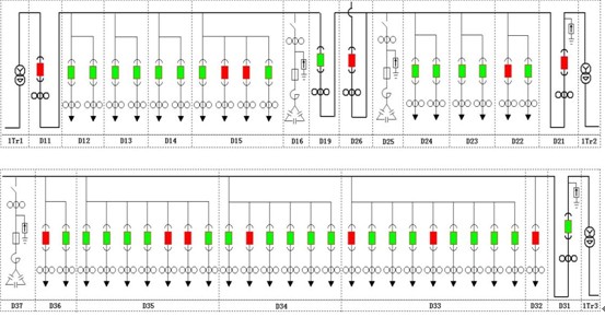 整個低壓配電系統包括20個低壓配電柜。其中三個進線柜,三個電容補償柜,兩個母聯和12個出線柜。12個出線回路的負載基本上是三相大功率電機。