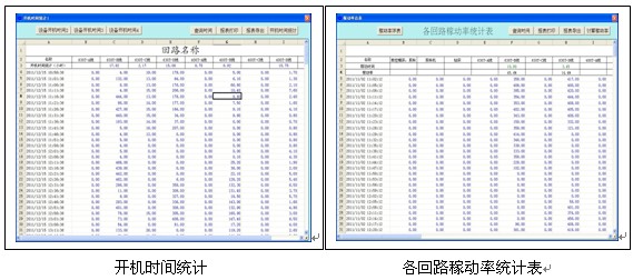 設備的稼動率報表功能窗口顯示的是單個回路的開機時間和稼動率值,也就是把功率曲線的各個數據進行加工,然后做成EXCEL表格的形式展示出來,兩者相互呼應,以便生產管理者對員工進行考核。從該表格和曲線可以明顯的看出設備在什么時候處于開機狀態,其中有多長時間是處于生產期,多長時間處于閑置期,很容易的就能掌握員工的工作情況。對單個的設備進行詳細的數據展示后,還有一個總的設備數據展示功能窗口,如下圖示: