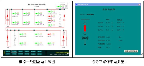 模擬一次圖配電系統圖從圖上可以直接看出該具體回路的合分閘情況,綠色表示分閘,紅色表示合閘。鼠標左鍵點擊某個具體的一次回路時,監控軟件將彈出該回路的詳細電參量。