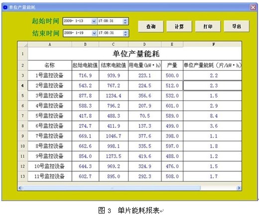 3.3.2 系統功能 整個系統實現了對一期配電房和二期配電房所有回路電能的采集和統計,遠程自動抄表、電能統計等功能,包括: a. 遠程電量參數測量,包括實時電能、分攤電能、總電能以及按各監控設備統計電能。 b. 運行狀態監測,通訊異常報警提示。 c. 用戶管理,不同用戶權限具備不同操作功能,各級權限具有口令修改操作功能和權限防誤功能。 d. 電能報表,實現了所有電能報表的按時間查詢,分為分鐘、小時、班組、日、月五種類型,包括總、尖、峰、平、谷復費率電能及用電量。 e. 電能柱形圖,任意回路電能實時電能柱形圖顯示,包括總、尖、峰、平、谷電能。 f. 匯總表,所有監控設備電能匯總,按時間段查詢,自動計算任意時段用電量。 g. 單位能耗,自動計算單位產量能耗,并可打印及導出。單位產量能耗計算界面如圖3所示。 h. 打印及導出,所有報表及界面均可打印,或以EXCEL、WORD格式導出。