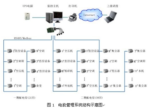 3.2 電能管理需求分析及系統構成 某公司廠房共有一期配電房1個、二期配電房2個,提供全廠的生產、照明、空調用電及其它用電等。原有配電系統只在全廠總進線回路上裝有電力部門的電度表,管理者只能從每個月電力部門提供的用電總數值得知本月電量能耗,至于電能都用在了什么地方,有沒有電能浪費,節能措施有沒有收到應有的效果,企業管理者不是很清楚。亟待一個合理的電能考核機制來實現電能的科學管理。