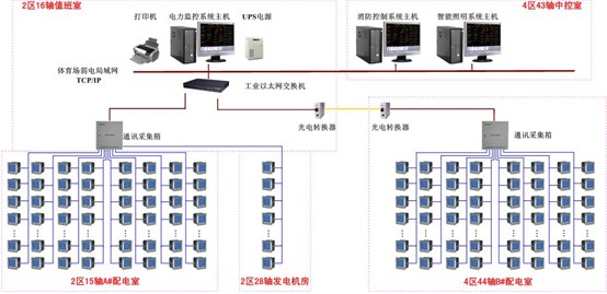 根據(jù)實際需求,為提高整個弱電系統(tǒng)集成度,位于43軸中控室的消防和智能照明系統(tǒng)主機均可通過體育場弱電局域網遠程連接本系統(tǒng)以獲得配電系統(tǒng)的實時數(shù)據(jù)。