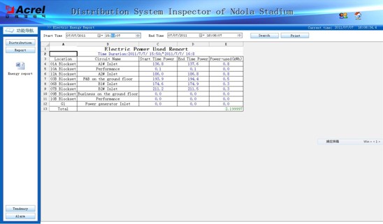 根據(jù)設計意圖,在體育場的低壓配電系統(tǒng)中,商鋪和舞臺演出部分都需要做電能計量,要求電力監(jiān)控系統(tǒng)能具有一定的電能管理功能。本系統(tǒng)提供給客戶一個能查詢電能報表并打印的界面,提供用戶查詢時間的自定義選擇然后生成電度計量報表,完成對進線回路、商鋪回路和演出回路的電度計量。