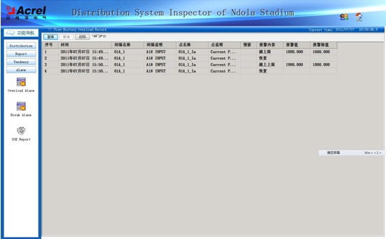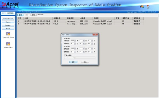 根據(jù)本系統(tǒng)的設計意圖,如果重要回路或者照明回路三相中某一相電流負荷超過額定值的90%,系統(tǒng)必須立刻發(fā)出聲光報警并彈出指示框指明報警源,提醒管理人員注意負載的三相平衡和負載率;根據(jù)現(xiàn)場技術人員要求,追求當某一個低壓配電回路斷路器發(fā)生變位時,同樣發(fā)出聲光報警和彈出報警框指明報警源的功能。報警記錄存于數(shù)據(jù)庫中,保存3年,用戶可以通過查詢功能查看指定時間域內發(fā)生的所有報警信息。