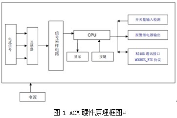 ACM配電線路過負荷監控裝置,采用最新的32位單片機技術,具有抗干擾能力強,工作穩定可靠、數字化、網絡化等特點。通過檢測線路的電流,實現配電回路的兩段式報警。該監控裝置可具有電流、電壓、有功功率、無功功率、視在功率、功率因數、漏電流測量功能、電流2~15次諧波分析功能、內置蜂鳴器、指示燈報警功能、報警事件記錄、RS485 Modbus-RTU、Profibus-DP協議通訊接口、開關量輸入、可編程繼電器輸出、DC4~20mA模擬量輸出等功能,方便與PLC、工控機等工控設備組成網絡,實現線路運行的遠程監控。監控裝置硬件原理框圖如圖1所示。