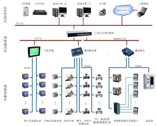 站控管理層針對能耗監測系統的管理人員,是人機交互的直接窗口,也是系統的最上層部分。主要由系統軟件和必要的硬件設備,如工業級計算機、打印機、UPS 電源等組成。監測系統軟件具有良好的人機交互界面,對采集的現場各類數據信息計算、分析與處理,并以圖形、數顯、聲音等方式反映現場的運行狀況。