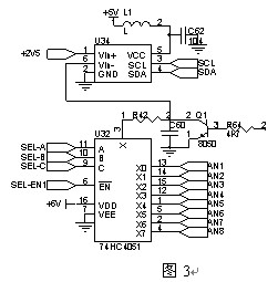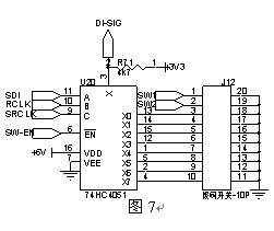 撥碼開關(guān)輸入電路用于設(shè)定本裝置的通訊地址、通訊波特率、數(shù)據(jù)格式等參數(shù),使用一個八選一模擬開關(guān)U20,對外部撥碼J12每一位進行動態(tài)掃描檢測,撥碼開關(guān)輸入和開關(guān)量輸入的控制總線為共用結(jié)構(gòu),此方式的優(yōu)勢是節(jié)約CPU的IO口線,缺點是程序處理稍復(fù)雜,需要使用動態(tài)掃描方式一路一路檢測(圖7)。