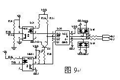 通訊方式采用RS485方式,使用高速光耦實現(xiàn)電氣隔離,由于 485接口芯片U20是半雙工結(jié)構(gòu),本電路的特點是由發(fā)送數(shù)據(jù)控制485芯片的發(fā)送和接收,實現(xiàn)了自動數(shù)據(jù)流控制,省略了一個流控制光耦,簡化了軟硬件設(shè)計。降低了成本。(圖9)