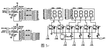 顯示部分電路使用串入并出移位寄存器74HC595兩顆級聯(lián)使用,其中U100的輸出作為數(shù)碼管的段碼,U101輸出作為數(shù)碼管的位選信號,使用動態(tài)顯示方式,逐個點亮數(shù)碼管,數(shù)碼管的位選信號還作為按鍵的檢測功能,CPU在“KEY”線輸出電平,當(dāng)某一位數(shù)碼管導(dǎo)通,如果此時接在此數(shù)碼管選通線上的按鍵按下時,“KEY”線會被拉低,CPU就會檢測到一次按鍵事件,再經(jīng)過按鍵消抖處理來防止多次觸發(fā)或誤判。(圖5)