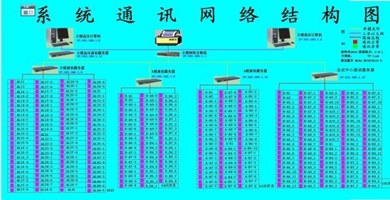 海門行政中心的值班室位于主樓負一層變配電室內,配置一臺工業網絡交換機;A樓變配電室現場采用8根總線,使用一臺8口的串口服務器,通過光纖連接至主樓值班室內的交換機上;B樓變配電室現場采用6根總線,使用一臺8口的串口服務器,通過光纖連接至主樓值班室內的交換機上;H樓變配電室現場采用5根總線,使用一臺8口的串口服務器,通過光纖連接至主樓值班室內的交換機上;再通過交換機把數據傳輸到工控機。