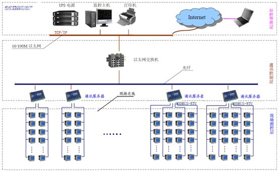 1 系統(tǒng)的結(jié)構(gòu) 本系統(tǒng)采用分層分布式計(jì)算機(jī)網(wǎng)絡(luò)結(jié)構(gòu)即間隔層、通訊層和站控層如下圖所示: