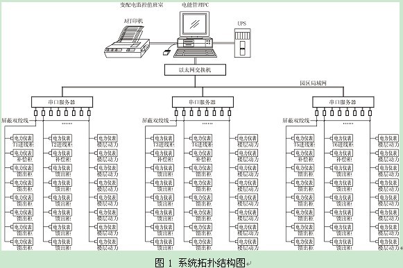 蘇州創(chuàng)業(yè)園二期電力監(jiān)控系統(tǒng)的拓撲結構如圖1。
