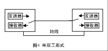 半雙工通信使用同一根傳輸線,即可發送數據又可接收數據,但不能同時發送和接收。在任何時刻只能由其中的一方發送數據,另一方接收數據。因此半雙工形式即可以使用一條數據線,也可以使用兩條數據線,如圖4所示。