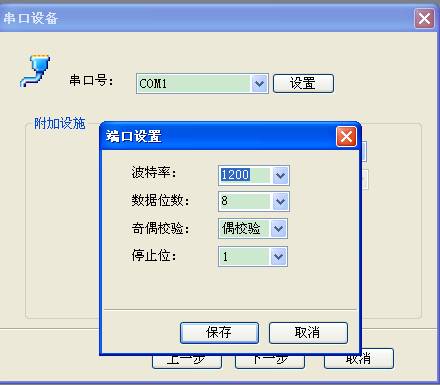 串口設(shè)備設(shè)置,選擇正確的串口號(hào)。然后設(shè)置端口。波特率初始為1200,數(shù)據(jù)位數(shù)8,偶校驗(yàn),停止位1.