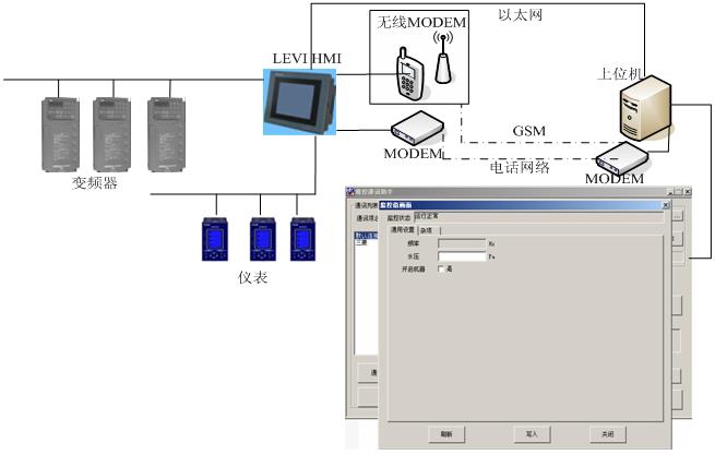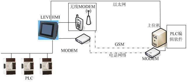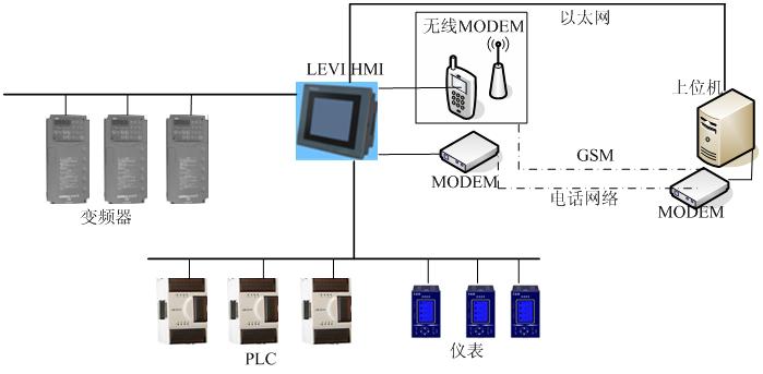 在該架構(gòu)中,LEVI HMI處于所有設(shè)備的中間,主要起到一個橋接的作用。通過電話、GSM、以太網(wǎng)等網(wǎng)絡(luò)形式,上位機(jī)可以隨時與遠(yuǎn)程的PLC、變頻器、儀表等設(shè)備進(jìn)行通信、調(diào)試,效果和在本地調(diào)試一樣。這樣有效的減少了維護(hù)成本與時間。