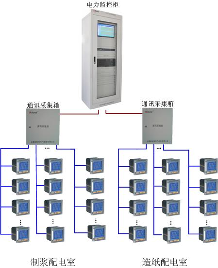 歐木特種紙業(yè)二期電能管理系統(tǒng)現(xiàn)場(chǎng)為新建的15#車間,2個(gè)低壓配電室:制漿配電室和造紙配電室,配電室內(nèi)采用安科瑞ACR系列電能管理儀表采集各回路的電流、電壓、電能等電參量,然后通過中間層采集設(shè)備經(jīng)局域網(wǎng)傳到監(jiān)控室計(jì)算機(jī)上,實(shí)現(xiàn)遙測(cè)、遙信功能。