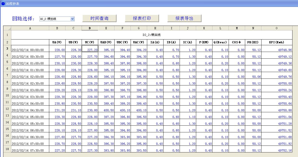 4.2 遠(yuǎn)程抄表查詢: 各個(gè)配電室各個(gè)回路按照時(shí)間段進(jìn)行歷史數(shù)據(jù)查詢。選擇回路后,可選擇時(shí)間間隔、時(shí)間長(zhǎng)度對(duì)該回路進(jìn)行歷史數(shù)據(jù)精確查詢,包括電壓、電流、功率、功率因數(shù)和電能等常用數(shù)據(jù)。查詢結(jié)果可導(dǎo)出成EXCEL表格進(jìn)行保存,也可打印保存。