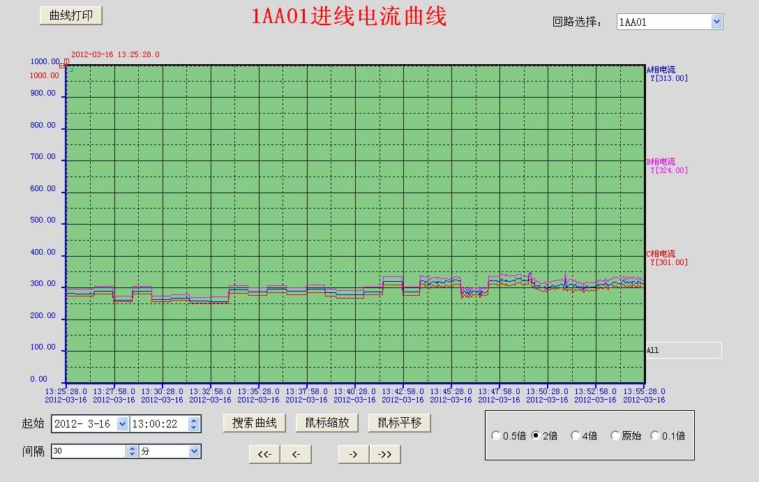 4.3 趨勢(shì)曲線: 各重要回路電流、功率實(shí)時(shí)趨勢(shì)顯示及歷史趨勢(shì)查詢功能。選擇回路后,該回路實(shí)時(shí)趨勢(shì)曲線會(huì)不斷刷新,選擇“起始時(shí)間”可查看該回路歷史趨勢(shì)曲線,選擇“時(shí)間長(zhǎng)度”可查看歷史日、月、年趨勢(shì)曲線,能更加直觀反映該回路運(yùn)行情況。