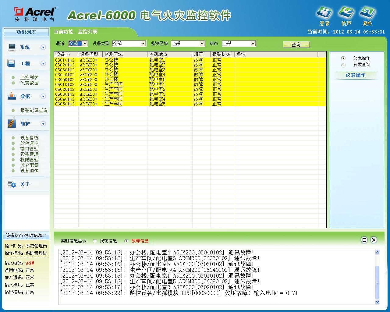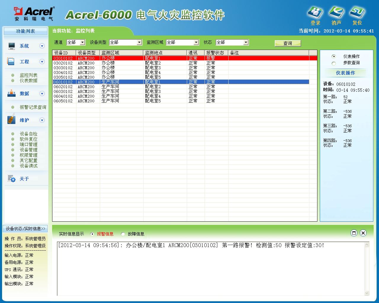 本套上位機軟件Acrel-6000電氣火災(zāi)系統(tǒng)。主要有以下功能特點:友好的人機界面,可實時和定時采集現(xiàn)場設(shè)備的剩余電流數(shù)據(jù)和溫度、并有報警提示聲光報警等功能。客戶可根據(jù)實際需要對報警溫度值、漏電流值進行設(shè)置,報警故障解除時,可遠方進行復(fù)位。系統(tǒng)可對報警事件、日期、報警值、越線值進行記錄,并生成報表,可對報警事件記錄進行打印。