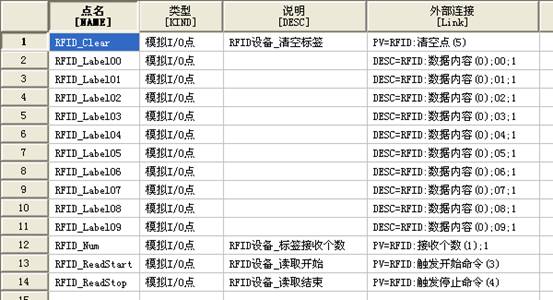 在點(diǎn)組態(tài)中根據(jù)需要建立一組標(biāo)簽內(nèi)容讀取的點(diǎn),以及讀取的開始結(jié)束、標(biāo)簽接收個(gè)數(shù)、清空等控制點(diǎn):