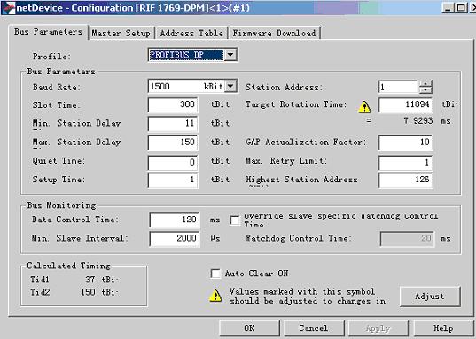 在Bus Parameters選項卡中,“Profile”,選擇“PROFIBUS DP”;可以根據需要設置站地址(Station Address),在網絡中不重復即可;其他出現警告的參數可通過點擊“Adjust”進行自動調整;如下圖: