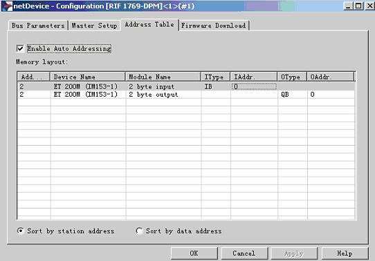 在Master Setup選項卡中,可以根據所帶從站的數量,調整“Watchdog time”,以提高系統的運行速度;在Address Table選項卡中,可以看到所帶DP從站的站地址和數據區域;在Firmware Download選項卡中,無需操作;