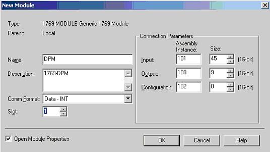 將RIF模塊組態到AB控制系統中,右擊“CompactBus Local”選擇“New Module”,在“Other”列表中,選擇“1769 MODULE”,然后根據DP從站信息配置參數:“Name”,可以設為“DPM”;“Description”,可以設為“ 1769-DPM”;“Comm Format”,設置為“Data-INT”;“Slot”,根據模塊的實際槽號來設置;
