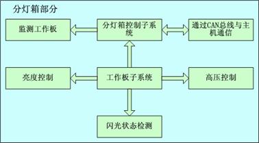 | 分燈箱部分由分燈箱控制子系統和工作板子系統組成,組成框圖及大致功能如下圖所示:
