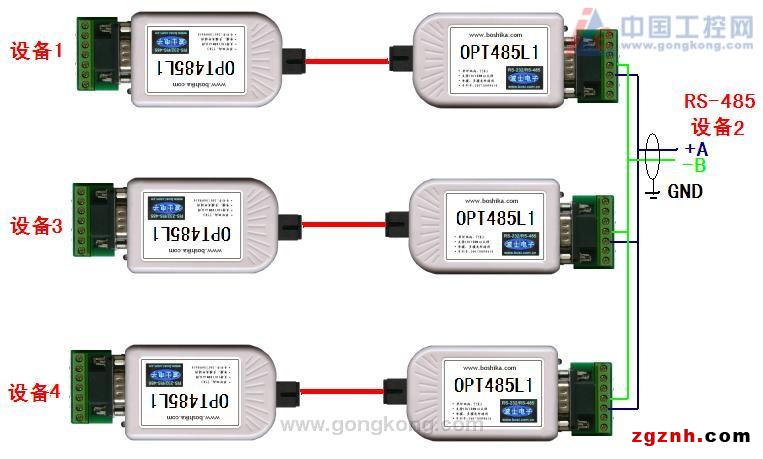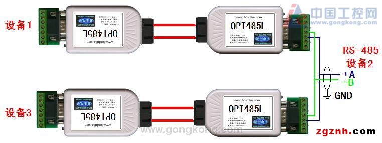 在使用中注意,因為OPT485L為雙纖雙向,所以成對使用時一個產品的光纖TX頭(發)通過光纖接對方的RX頭(收)、RX頭接對方的TX頭。將中間的兩個OPT485L的A-A相連、B-B相連、再一起接到設備2的RS-485口上。實際上,在設備1或者設備3端還可以繼續級聯。理論上,具有波仕零延時切換技術的光纖轉換器的級聯數不受限制。凡是有延時的,或者用數據流來啟動切換的所謂的“流控”技術(實際延時為1個字節),往往在多級級聯之后會累積延時導致通信失敗。