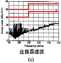 連接器濾波器的主要特點是濾波特性好。這從圖4中可以看出,圖4(a)是在線路板上使用濾波器,目的是濾波電纜上的高頻成份,減小電纜的輻射。圖4(b)是使用連接器濾波器,目的同線路板上的濾波器然濾波器將驅動電路上的高頻成份濾掉了,但機箱內的干擾還會耦合到電纜上,傳導到機箱外,造成輻射。同樣,外界的干擾也會通過電纜傳導進機箱,干擾線路板上的電路。而連接器濾波器則不然,由于它直接安裝在機箱上,可以保證暴露在機箱外邊的電纜是經過濾波的“干凈”電纜,不會產生輻射,同樣外界的干擾在進入機箱前就被濾除了,確保線路板不會受到干擾。兩者的實際濾波效果可以從圖5的比較中看出。圖5(a)是電纜沒有經過濾波的設備產生的輻射,圖5(b)是在線路板上連接電纜處安裝了濾波器后設備的輻射,圖5(C)是使用了連接器濾波器的結果。從圖中可以看出,連接器濾波器的濾波效果好于板上濾波器。