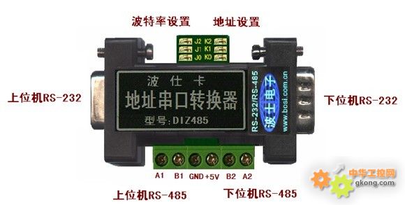DIZ485串口地址轉換器用于實現不同地址的RS-232/RS-485口的通信轉換,純硬件跳線設置,無需任何軟件設置。串口地址轉換器的外形為DB-9/DB-9轉接盒大小,如圖的產品左邊為上位機的RS-232以及RS-485口,右邊為下位機的RS-232以及RS-485口,上邊為波特率設置和地址設置的跳線,下面為5V電源接線端子。DIZ485通過跳線J2、J1、J0設置波特率,通過跳線K2、K1、K0設置地址。見下表。0-斷開,1-短路。注意每次更改跳線新設置后必須重新加電源才能生效。