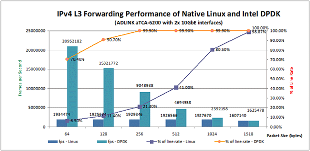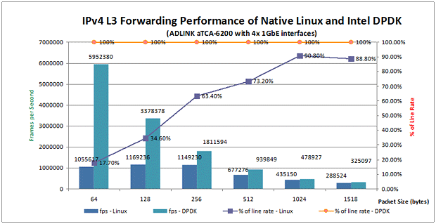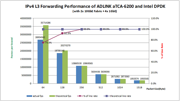 此外,Intel® DPDK還提供了一種方法,即可以設置每個執行單元運行在每一個核心上,以維持更多的Core Affinity,從而避免緩存丟失。在此白皮書描述的測試中,aTCA-6200處理器刀片的物理端口根據Affinity被綁定在兩個不同的CPU線程上。