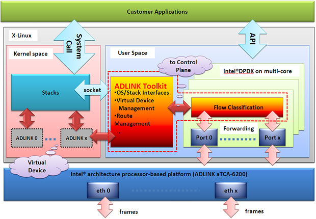 相比之下,Intel® DPDK在自己保留的內存區域接收數據包,這個區域位于用戶空間(User Space)緩沖區,之后根據配置規則將這些數據包分類到每一個Flow中。在處理完解封包之后,在相同的用戶空間(User Space)緩沖區中使用正確的報頭進行包封裝,最后通過相關的物理端口發送這些數據。