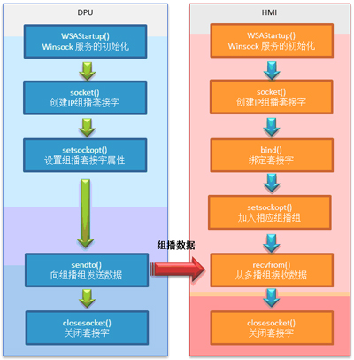在實際應用中,IP組播編程實現的方法隨DPU嵌入式支撐系統和HMI運行系統平臺的不同有所不同的;編程人員通常借助于操作系統中所提供的網絡數據通信編程接口實現網上的IP組播通信的功能。下面以在Microsoft Windows環境下的網絡編程接口(Windows Socket,簡稱Winsock)介紹具體的IP組播編程實現的方法。