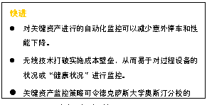 在選擇資產管理策略時,實現可靠性最大化和維護成本最小化的理想方案是自動化監控,這是 一種可對資產健康狀況提供實時在線指示的監控策略。自動化監控能夠檢測到可能引起設備意外故障的過程狀況,掌握了不利過程狀況知識的操作人員可據此對其進行調整,從而避免影響過程的設備故障。當故障即將發生時,資產健康狀況在線提示功能可發出預報,確保工廠有足夠時間安全地安裝備用設備,從而避免過程異常和不合格產品的產生,并排除因意外跳車引起的安全事故。先進的預報功能可為維護人員在判斷檢修時機以防出現故障時提供所需信息,甚至可提供無備件資產的相關信息。自動化監控可在控制室內完成對資產的監控,省去了維護人員前往現場采集數據的必要,尤其是當現場存在危險的情況下。