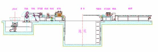 上料臺車將金屬卷材送至開卷機上。板材由開卷機引出,經過展平機初步整平,送入修邊機實施板材縱剪,按工藝要求完成板材寬度的加工。校平機由15根校平輥(七上八下)和一對牽引輥組成,它也是這條生產線的主牽引機。經過校平機后,平整的板材經緩沖坑,然后,由定尺送進按一定的板材長度定量送入剪扳機實施板材剪切。皮帶機將加工完好的合格板材輸送到堆料小車上。兩臺碎邊機安裝在修邊機后,分別將縱剪下來的兩條下腳料破碎,以便運輸存儲。為了提高生產效率,加快剪切速度,本生產線上的橫剪刀采用液壓馬達驅動。 由本生產線的工藝流程可以看出:開卷、展平、修邊、碎邊和校平應在一個線速度V1下同步運行。定尺送進和皮帶之間設有橫剪刀,因此,定尺送進、皮帶和橫剪刀是斷續運行,同時,它的運行速度V2應大于V1。在校平機與定尺送進機之間的緩沖坑,其作用是:平衡V1和V2之間的速度關系,保證生產線的穩定運行。