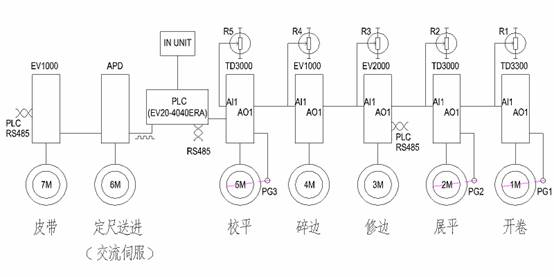 我公司最近研發生產的金屬薄板開卷修邊校平橫剪復合生產線,應用了當前最先進的電氣控制技術。采用了TD3300張力控制專用變頻器,成功地解決了開卷機與生產線同步運行的問題。現將本生產線的設計過程概述如下,僅供參考。