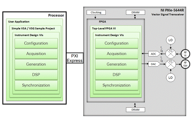 圖2. NI PXIe-5644R矢量信號收發(fā)器的架構(gòu)可允許在主機(jī)或設(shè)備固件中仿真和部署用戶可編輯的DSP塊。同時也可以對其他輸入/輸出以及內(nèi)存接口進(jìn)行修改以作為算法設(shè)計的補(bǔ)充。