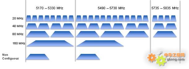 802.11ac可支持5 GHz波段并強制包括20、40和80 MHz帶寬。支持160 MHz當前為可選項。可選項還包括非連續80+80 MHz TX和RX帶寬。