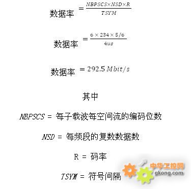 以下步驟可用于計算下列配置的數據率:80 MHz帶寬、帶800 ns保護間隔的64-QAM信號以及一條空間流。基本上有234數據載波(242—8導頻)。符號率計算方式如下:256/80 MHz + 800 ns (GI)。將數值代入數據率公式可得: