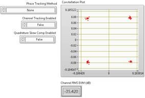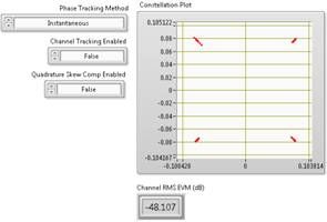 圖9. 上圖顯示了80 MHz 802.11ac信號進行相位跟蹤對EVM數的影響。該圖表在256-QAM信號圖中僅顯示了4個符號。