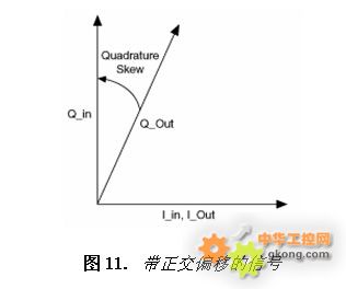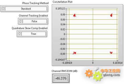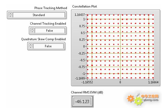 WLAN分析工具包也可以補償由于發生器/DUT引起的相位偏移。圖11顯示了帶正交偏移的信號。正交偏移補償最適用于帶大量點的調制方式(如256 QAM)。