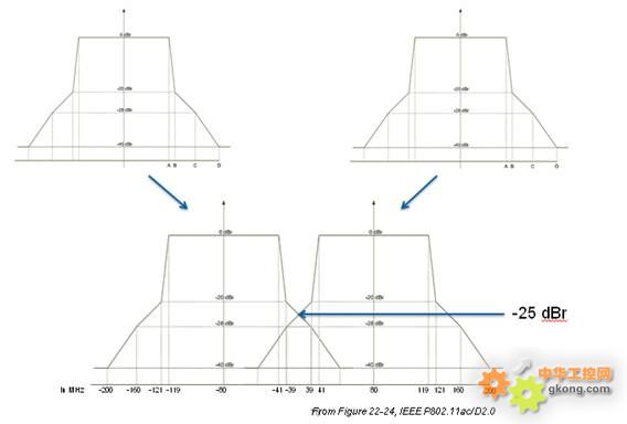 802.11ac要求強制80 MHz頻譜屏蔽測試。可選項也包括80+80 MHz和160 MHz頻譜屏蔽測試。80 MHz段可以為連續或非連續(在不同波段中)。