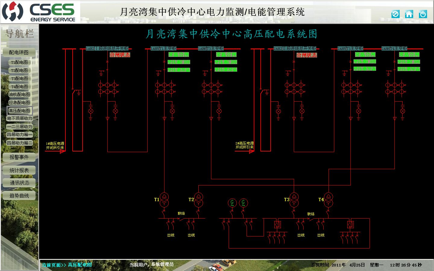 3 案例分析 蘇州月亮灣集中供冷中心的20/0.4kV配電系統進行監控;監控范圍為四樓變電所的T1、T2、T3、T4變壓器進線柜、聯絡柜、應急照明配電屏1/2、應急動力配電屏1/2、高壓柜、三樓變電所的1/2#柴油發電機配電屏和各樓層所有動力柜,對這些配電回路進行遠程實時監控和電能管理。 進線回路采用ACR230ELH多功能諧波儀表,其是針對電力系統、工礦企業、公共設施、智能大廈的電力監控需求而設計的網絡電力儀表,它能測量所有常規電力參數,如:三相電壓、電流、有功功率、無功功率、功率因數、頻率、有功電度、無功電度、并可監測電壓、電流的2-31次諧波分量等多種電參量。并且本儀表帶有4路光電隔離開關量輸入接點和2路繼電器控制輸出接點,這些接點可以配合智能斷路器實現斷路器的遙信、遙控操作。該系列網絡電力儀表主要應用于變電站自動化、配電網自動化、小區電力監控、工業自動化、能源管理系統及智能建筑等領域。 重要配出回路采用ACR220EFLK系列網絡電力儀表,該儀表主要完成三相電流、三相電壓、有功電度的測量、復費率電能的計量以及開關信號的檢測和繼電器遙控輸出。 高壓側實時畫面見圖1,為系統主監控畫面,主要實時監測高壓回路的運行狀態,紅色代表合閘,綠色代表分閘。