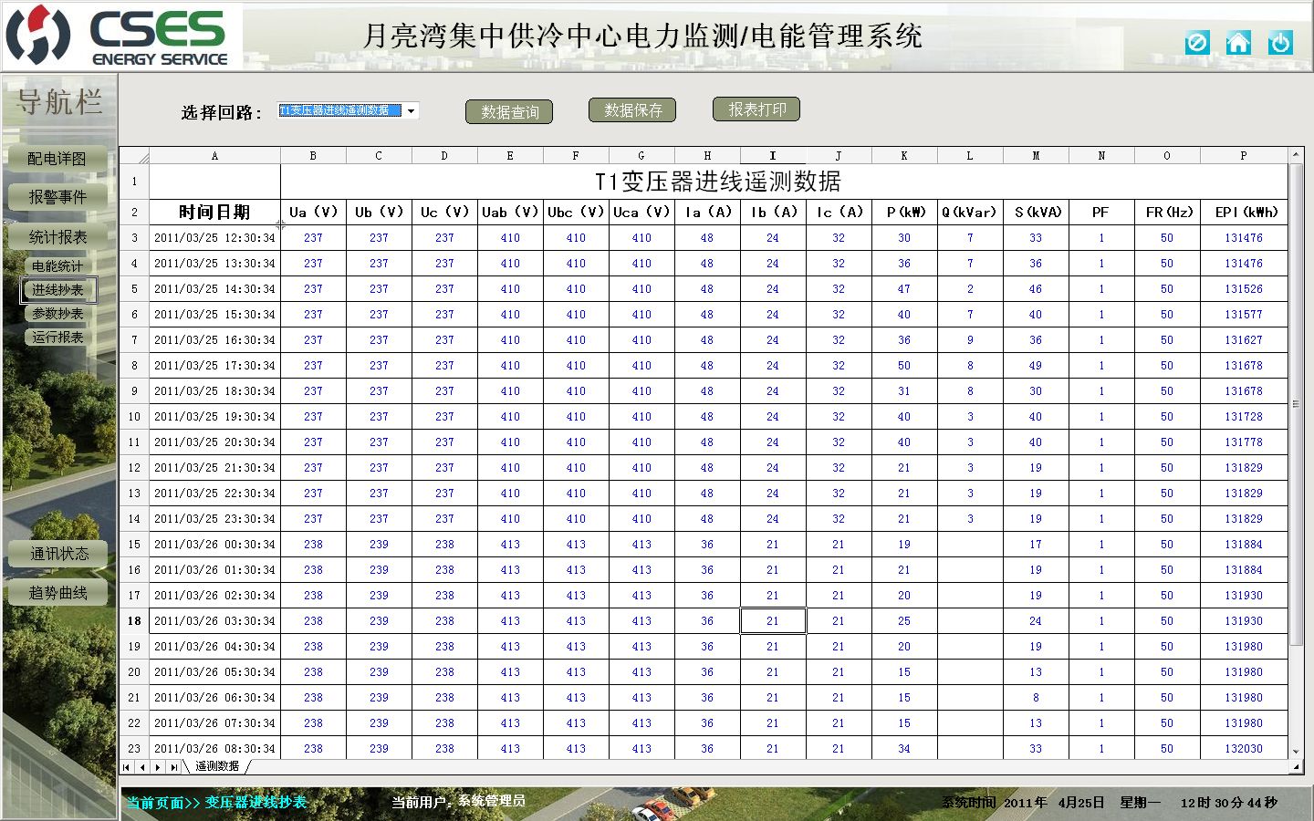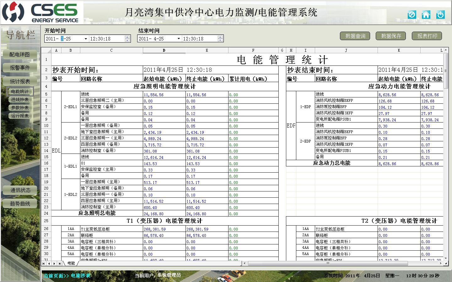 蘇州月亮灣集中供冷中心低壓配電二次圖見圖2,功能有電量遙測主要監測運行設備的電參量,其中包括:線三相電壓,電流,功率,功率因數,電能,頻率等電參量及配出回路的三相電流;遙信功能實現顯示現場設備的運行狀態,主要包括:開關的分、合閘運行狀態和通訊故障報警;遠程抄表功能,主要完成對各主要回路的遠程集抄功能,可選擇時間段進行查詢見圖3;