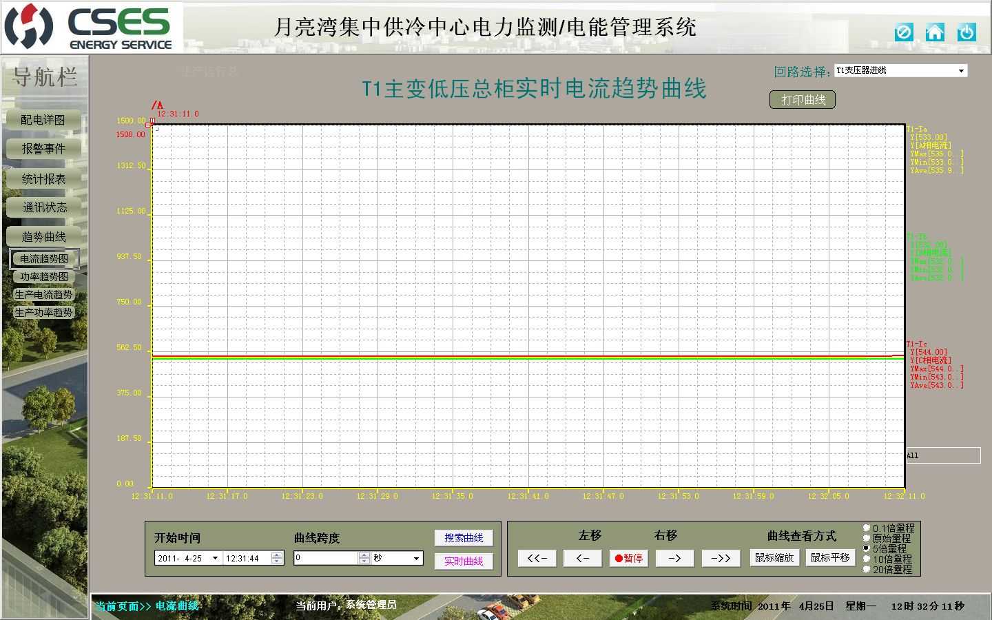 2.6 運行負荷曲線 負荷趨勢曲線功能主要負責定時采集進線及重要回路電流和功率負荷參量,自動生成運行負荷趨勢曲線的,方便用戶及時了解設備的運行負荷狀況。點擊畫面相應按鈕或菜單項可以完成相應功能的切換;可以查看實時趨勢曲線或歷史趨勢線;對所選曲線可以進行平移、縮放、量程變換等操作,幫助用戶進線趨勢分析和故障追憶。